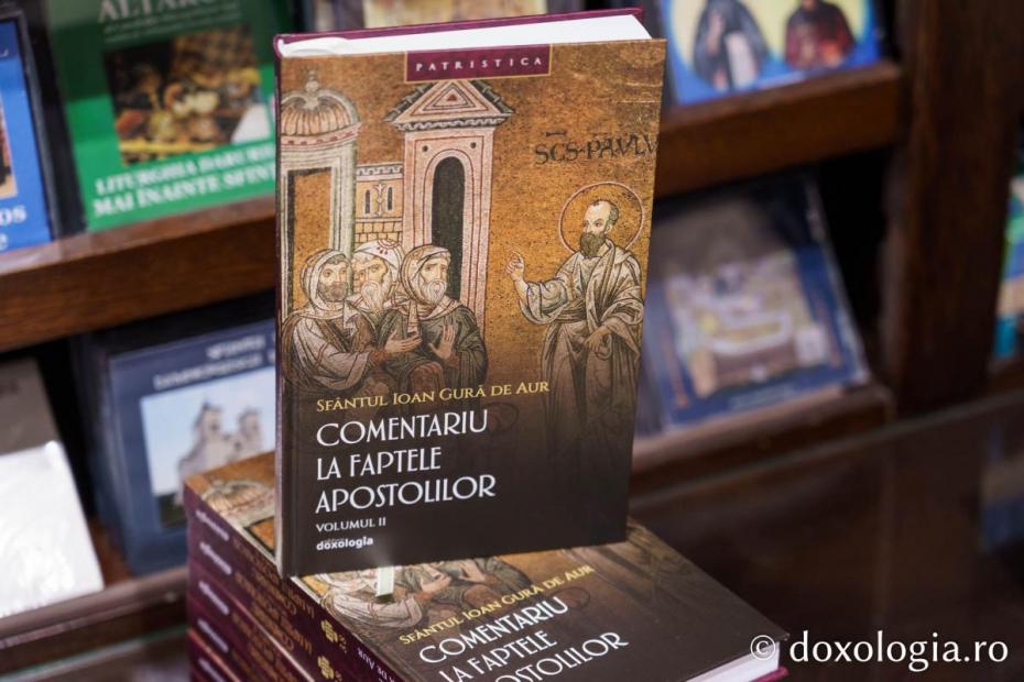 Sfântul Ioan Gură de Aur este unul dintre autorii preferați ai editurii Doxologia, dovadă fiind faptul că editura noastră a publicat, în decursul a zece ani, mai mult de șapte volume în colecția „Patristica” și mai mult de șapte volume în colecția „Biblioteca Paisiană”. Astăzi, am prezentat două dintre cărțile exegetice ale Sfântului Ioan Gură de Aur: comentariul la Faptele Apostolilor și comentariul la Ieremia și Daniel. Sunt două cărți foarte importante, mai ales comentariul la Ieremia și Daniel, deoarece acestea sunt traduse acum în premieră mondială. De exemplu, pentru comentariul la Ieremia nu există o traducere în limbile moderne; există doar o traducere în Patrologia Graeca, în limba latină, iar aceasta este marea noutate.